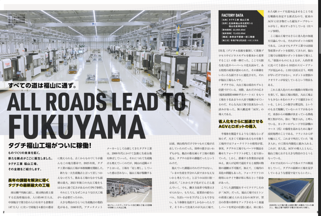 今回の『タグチ通信』最新号の特集は、今年の秋から本格稼働を開始した福山工場。DX化の成功モデルとなった大山工場を経て、さらに進化を遂げた新工場に込められた思いとはー。