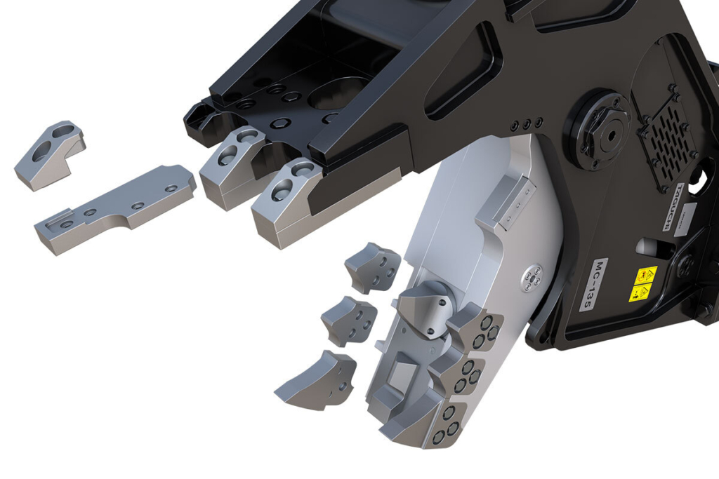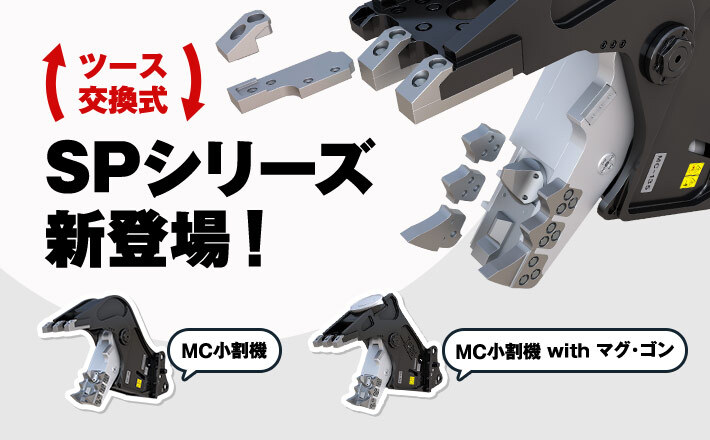 ボルトオンタイプの交換式「SPツース」を搭載したMC大割機が登場! 交換式ツースは耐摩耗性に優れた素材を使用しているため、溶接タイプのツースよりも2倍長持ち(当社比)。ボルトオンタイプで、現場で摩耗した場合でもすぐに交換できるので、肉盛り等に時間をとられることもありません。