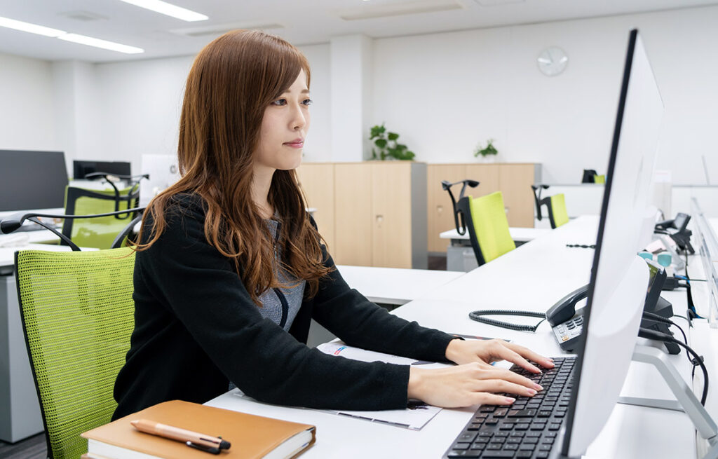 私は医療・福祉関係の大学卒で、前職は歯科の受付事務として働いていました。ところが医療関係以外の事務職に挑戦したいなと転職活動をはじめて、求人情報サイトでタグチの求人を発見。全く違う業界への転職は不安でしたが、同じフロアで働く皆さんの雰囲気がすごく良くて。経理、総務、経営企画室の主に女性社員の皆さんは、フランクでサバサバ……(笑)。受付や電話対応、お茶出しなどの雑務はみんなで協力しながら行っています。オフィスや給湯室もキレイで働きやすい環境だなと思います。難しい仕事でも乗り越えられたのは、皆さんのおかげですね。
