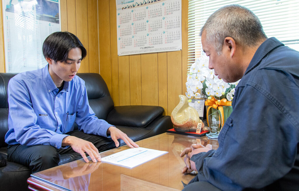 「お客様に喜んでもらいたい」という気持ちですね。そのために、細かいところまで気を配り、できる限りお手伝いするように心がけています。例えば、お客様から「これ困ってるんだよね」「今すぐ来れないかな」とご相談いただいた時には、まず現場に伺います。解決できるかどうかは別として、まずは現場に伺う。そうすることで、何か解決策が見つかるかもしれないし、お客さんにも「対応が早い」「うちのことを大事に思ってくれている」と感じてもらえると思うからです。それに、もし現場で解決できなくても、次の案をその場で立てることができますし。技術や知識がまだ十分でない分、一生懸命動いて全力を尽くすことを心がけています。