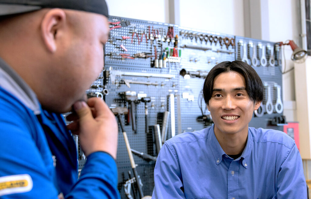 研修や配属後のOJTが充実していることだと思います。研修期間は入社後の約半年間。メンテナンスや製品修理、建設業界の基礎知識などを実際に製品に触れながら学びました。配属後は3ヶ月間、先輩社員の営業に同行し、OJTを通して実務を学んでいきました。最初は、地域や人によって専門用語や方言の違いに戸惑いましたが、お客様の業種に合わせて、必要な知識を質問したり、情報交換をすることで、少しずつ知識を増やしているところです。入社3年目になりますが、まだまだ知識不足を感じています。これからもお客様との会話を通して、多くのことを学んでいきたいですね。