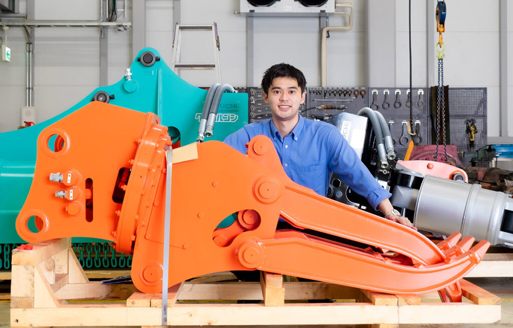 入社前に印象的だったことは、営業所まで見学へ行ったこと。タグチ製品を目の当たりにしたときに、ホームページやカタログから想像していたよりも実物はもっともっと迫力があって「何だこの製品!」ってすごく驚きました。でも驚きと同時に自分がこの製品を売る営業になれるなんて、面白そうだなってワクワクしましたね。前職では今とは畑違いの仕事に携わっていました。入社当時は営業経験も建機の知識もゼロからのスタート。「アタッチメントってなんだろう?」というスタートでしたが、不思議と不安はありませんでした。