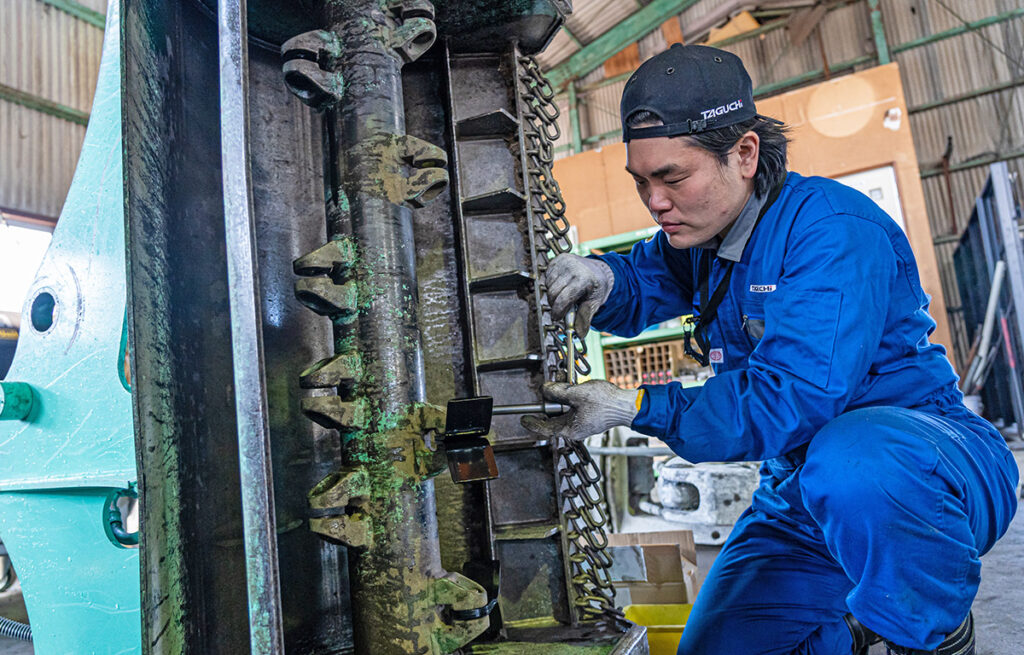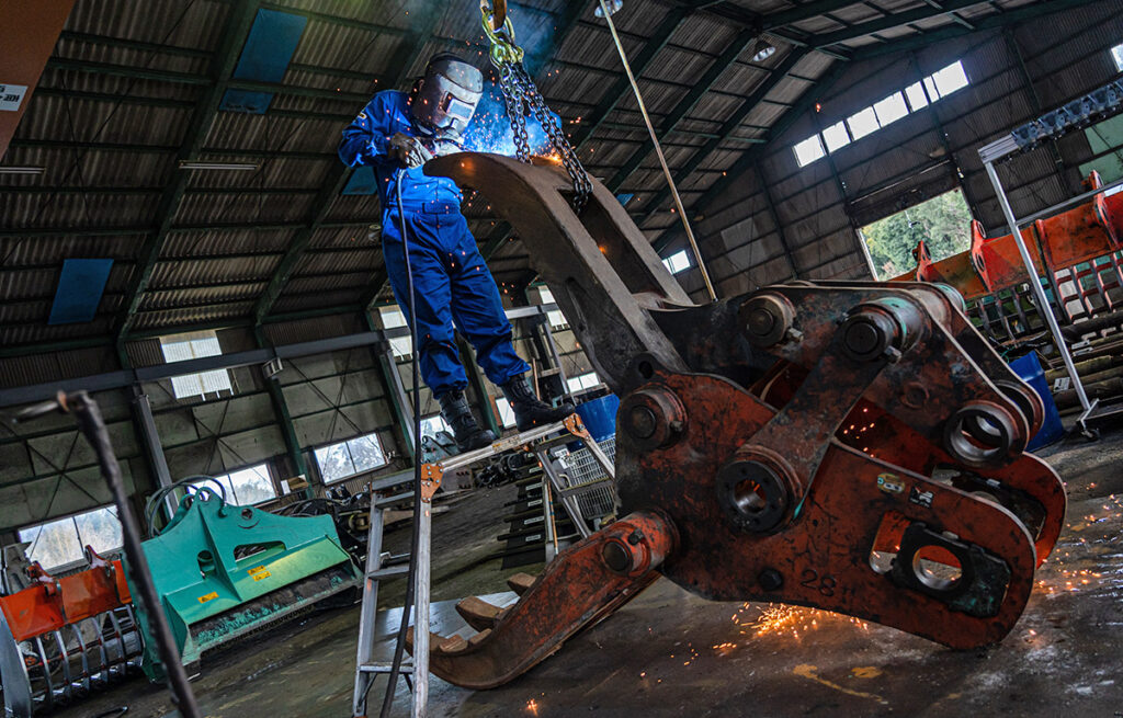 そうですね…。やっぱり体力ですね(笑)。アタッチメントの部品って重たいものが多いので抱えて持っていると筋肉痛になることもあって、最初は特に大変でした。でも重くて抱えて持っていると制服が汚れてしまうんです。研修でお世話になった工場長に「制服が汚れないように立ち回るのがプロの仕事だ」と言われたことが印象的だったので、体力づくりと合わせて効率の良い立ち回りが出来るように段取りを意識しながら動くことを心がけています。はじめは覚えることが多いと思うかもしれないですが、仕事の流れを掴めてくると自然と覚えていけますよ。