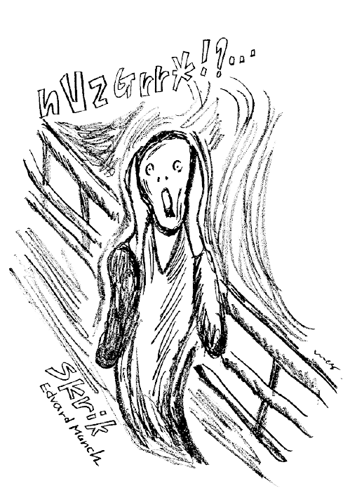 橋の欄干を背にして、耳に手を当て口を大きく開けている男。タイトルの『叫び』はこの男の叫びだと思われがちだが、実はこの男は幻聴・幻覚に見舞われており、その恐怖と不安に耐えているという絵なのだ。男の口から放たれているのは悲鳴であって、幻聴が叫びであるととらえるのが正しい解釈。ムンク自身がそう述べているのだから。では、どんな恐ろしい幻聴(叫び)だったのかというと、そこは作者のムンクのみぞ知るである。