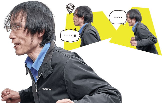 新卒で設計として入社して、もう9年目になりました。今、叫びたいことですか? そうですねえ、ない、ですねえ。私生活や仕事、何でもいいんですか? いやぁ……本当にないですねえ(笑)。変わったことですか。最近ではないですけど、昼ご飯は会社のお弁当を食べるようになりました。ええ、以前、『タグチ通信』で取材していただいた通り、昼休みは工場からすぐの家に持ち帰ってゆっくり食べています。あ、「ない!」でいいですか。分かりました、それなら気持ちを入れて叫んでみます!