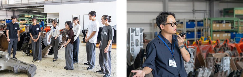 その後、2グループに分かれて岡山営業所にあるバケットランド岡山の工場見学を行いました。「このアタッチメントは何でしょう?」という質問には、製品パズルで学んだ知識をさっそく生かして、皆さんすぐに名前を答えてくれました。