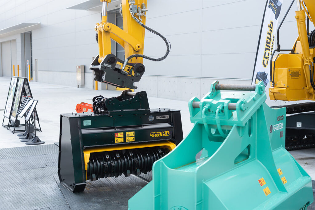 最新作「タケカルゴン」実機デモをはじめ、完全油圧式ワンキャッチの着脱を披露。アタッチメントの大きさに圧倒される方もちらほら。